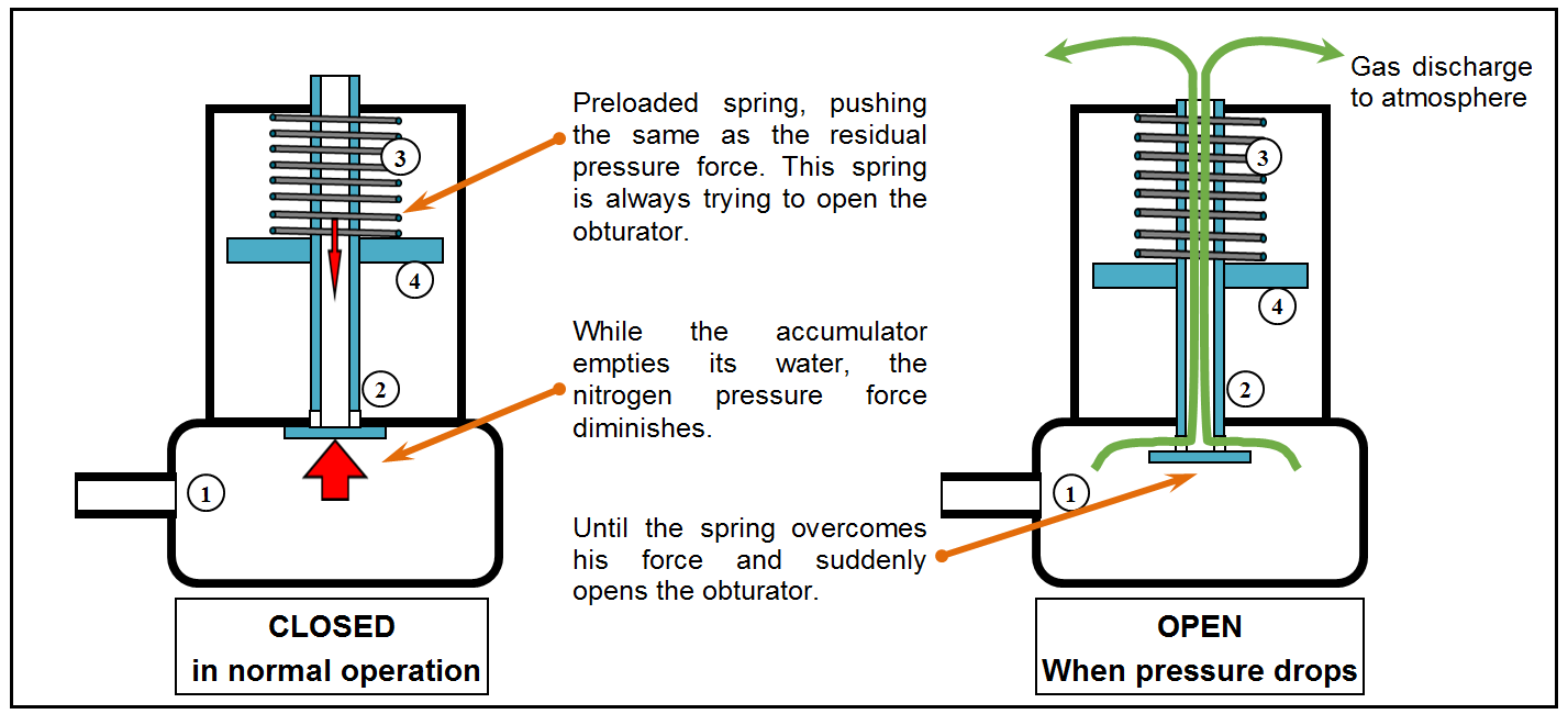 But when the accident comes, sooner or later the accumulators will actuate injecting their water into the system. During the water injection, the nitrogen will expand, and the pressure inside the accumulator will drop until a certain value is reached. Then, the opening spring force is enough now to move the obturator away from its seat, opening the path from the pressure chamber to the exhaust ports.